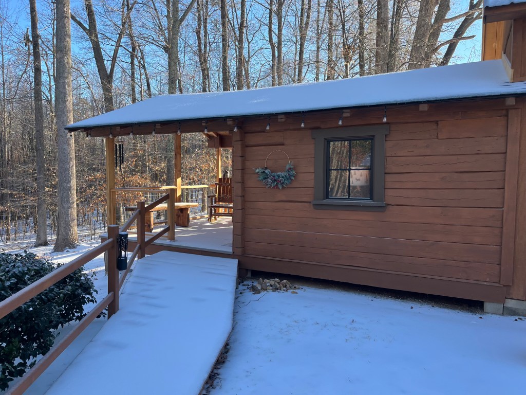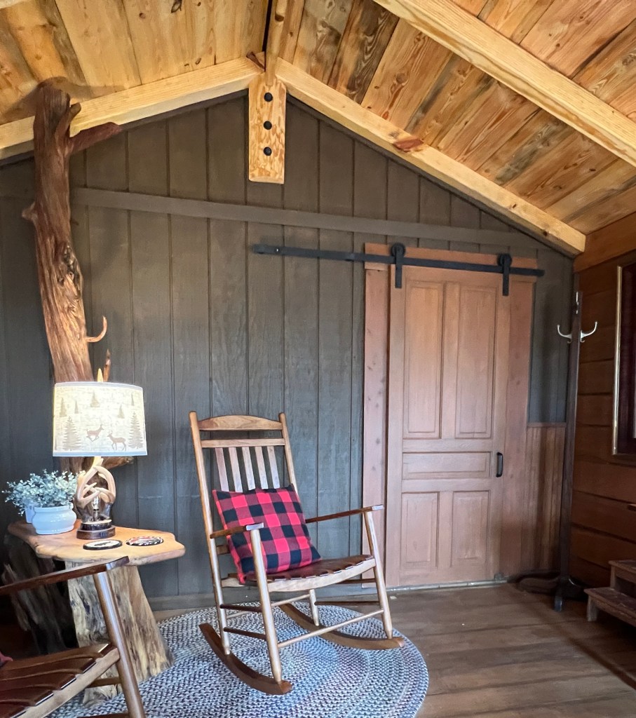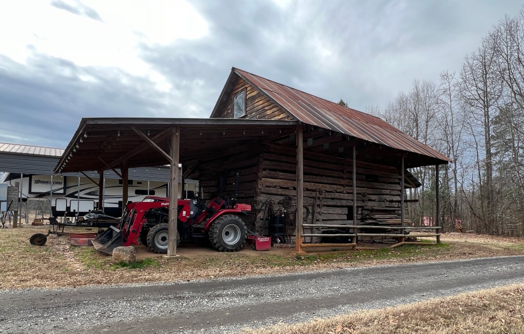 As you look at their home, the swing, the building behind it, the workshop, the stone work, and Terry’s new cabin – bear in mind he built everything you see. Much of the wood is from the trees he felled on their property and cut into lumber himself. His career was in historic home and barn restoration. An example of this is the colonial era barn pictured here with a red tractor.