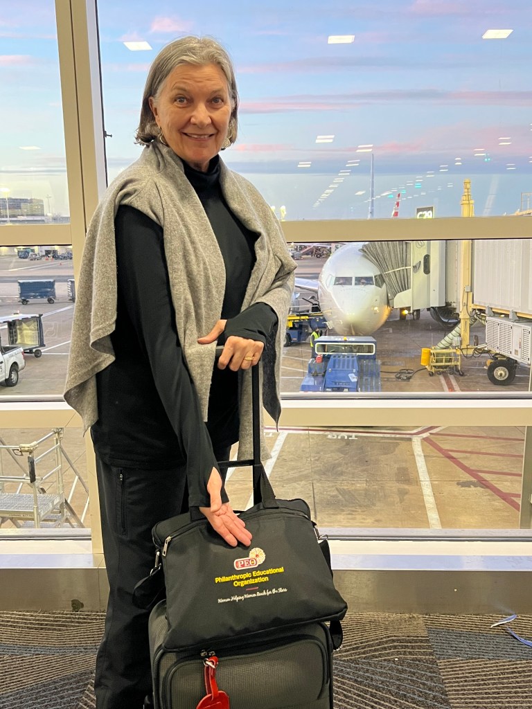 It’s been a wild and wonderful (mostly) 6 weeks! The photo below highlights Chris’s membership in PEO (Philanthropic Educational Organization) – a 150+ year old group of women supporting women by providing college scholarships. PEO even has its own college for women – Cottey College in Missouri. It delights Chris to promote the organization by displaying her bag during travels.