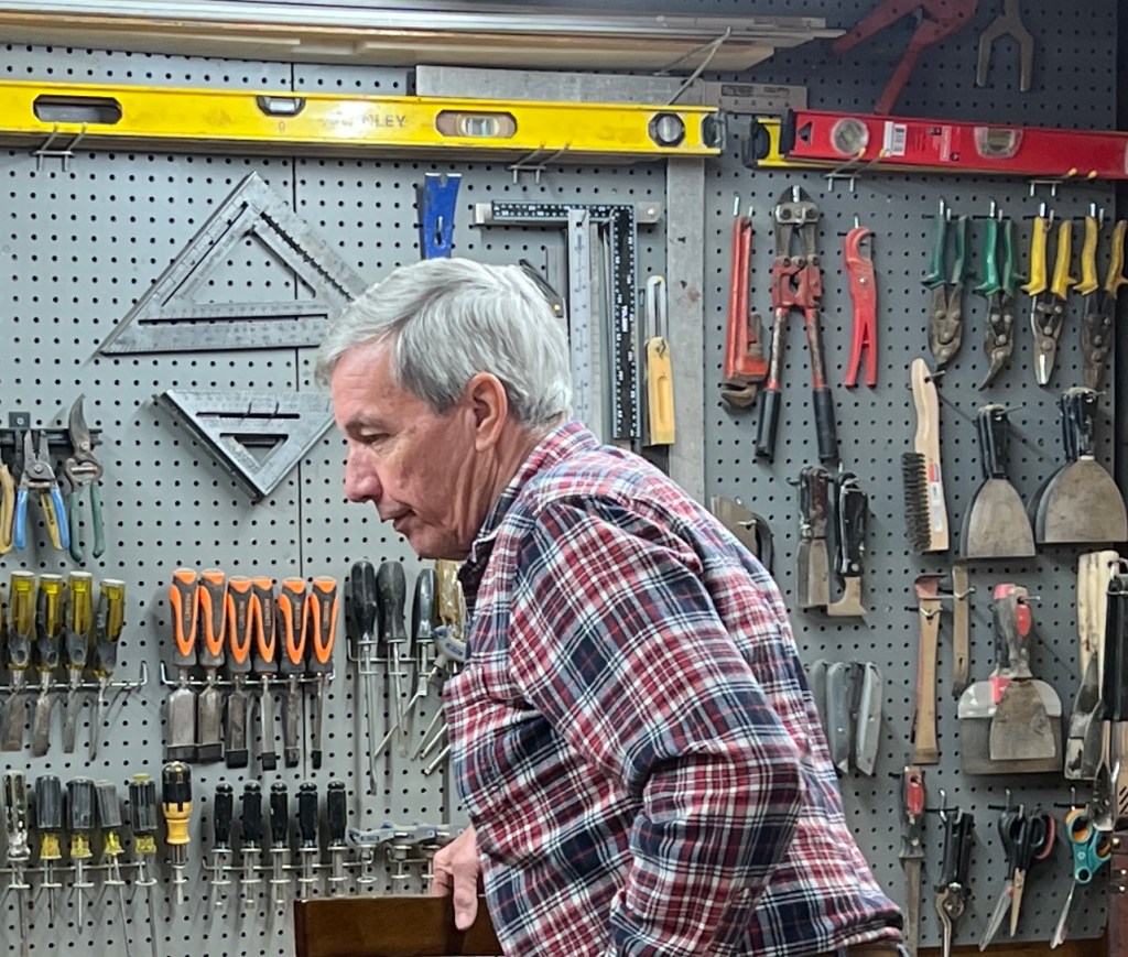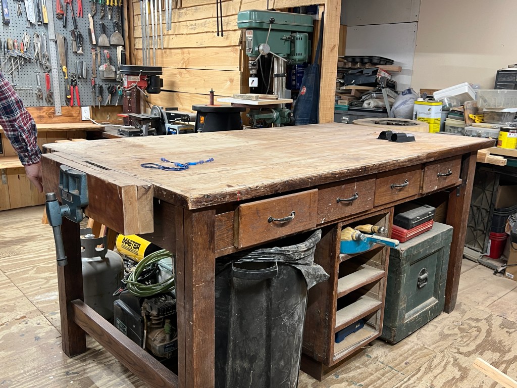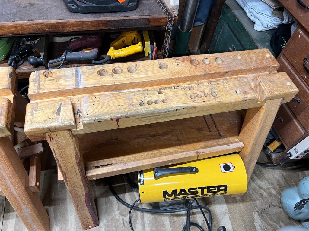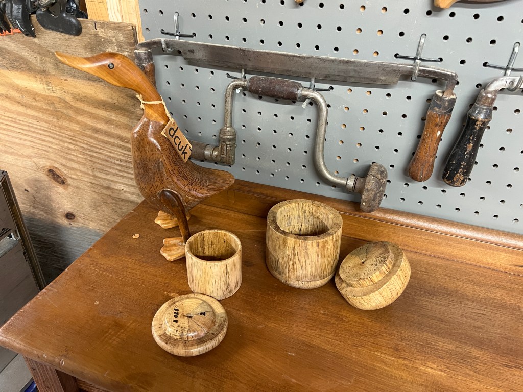 Finally… note the photo of unusual sawhorses with holes. The holes in the sawhorses are for dowels and wedges to hold pieces of wood in place as he carves. The wooden jars and lids are examples of his carving. Terry is now specializing in “green wood” woodworking as was done in previous centuries when kiln dried wood was unavailable to farm craftsmen.