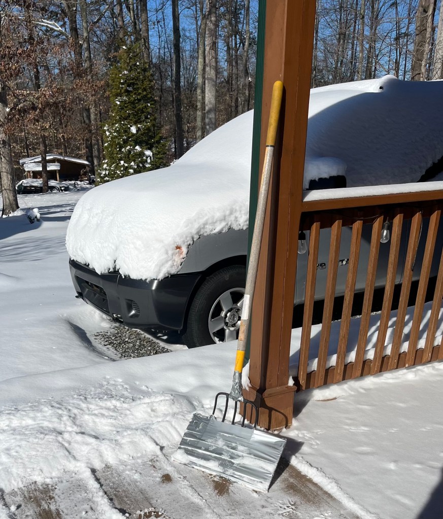 Here are the family snow reports. Seth & Megan Howard got 20″ of snow in Cornwall-on-Hudson, NY. Sam & Kat Howard got 10″ in Queens., NY. Zach Howard got 5″ (plus ice on top of it) in Richmond VA. Caitlin and the Gibsons got 6″ in Baltimore, MD. The photos below are of Terry’s makeshift “pitchfork shovel” he cobbled together with plywood and duct tape. They got 10″ in Salisbury, NC. The last snow picture we took in Georgetown showing that some people just didn’t have shovels.