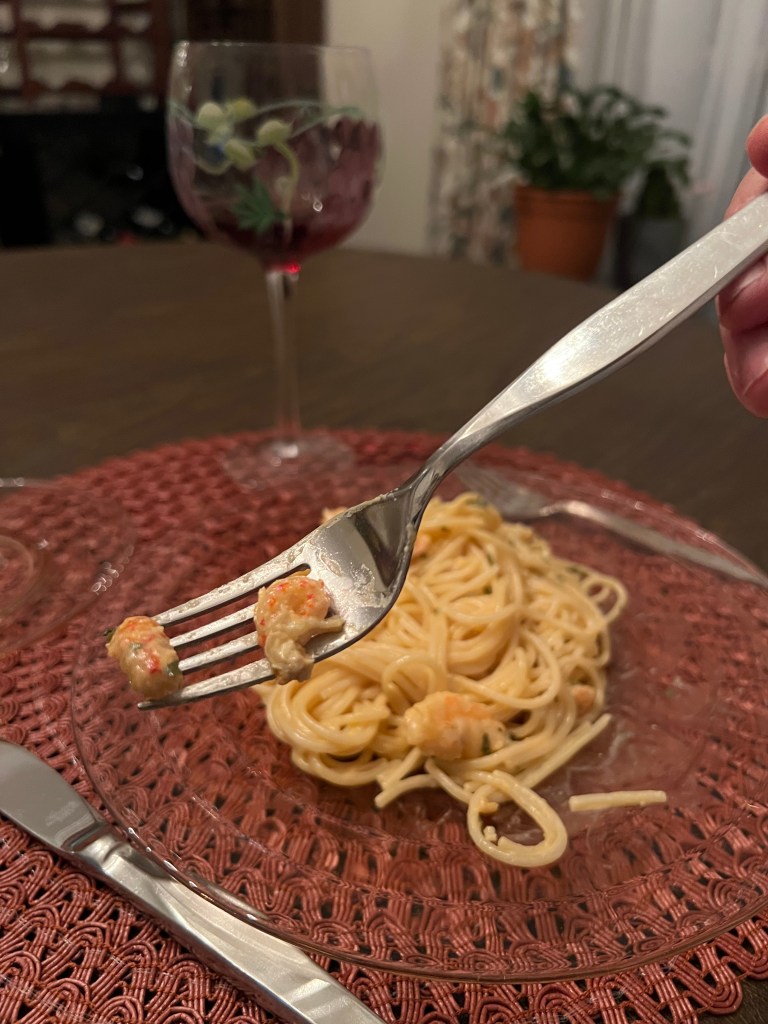 Back at her home in Algiers parish, she made crawfish and shrimp pasta. The crawfish (pictured on the fork) are a great delicacy