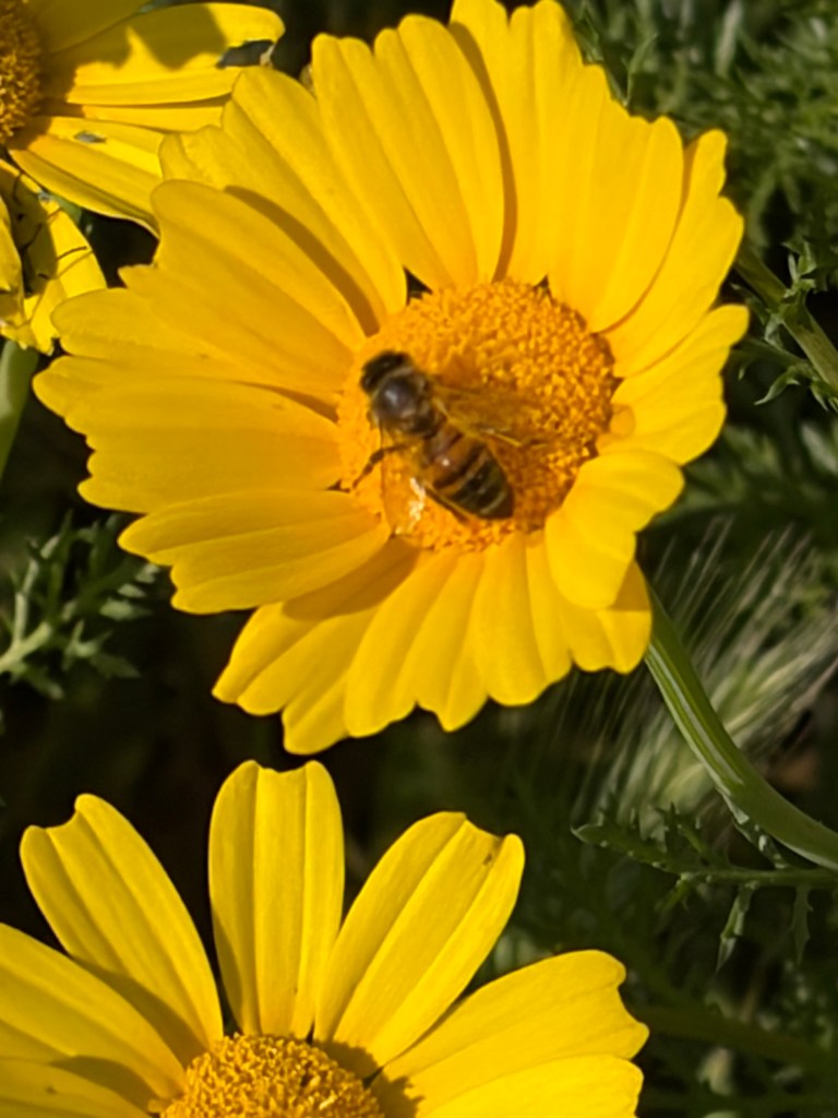 A forager working on a crown daisy. The meadows are covered in these yellow blossoms in the spring.