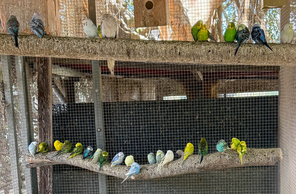After that nice greeting from the cockatoo we were guided along the way by a chicken… You will recognize a peacock, an owl, a stork, budgies, and flamingos as we go along the way.